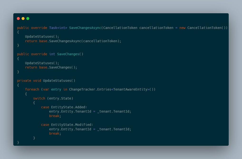 Now in our DbContext, we need to hijack the save process. This might sound daunting but it is quite straightforward. We will override the SaveChanges function and for each entity saved we will set the value of TenantId.