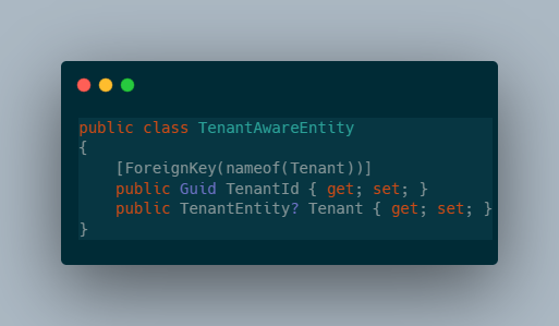 Firstly, I created a new base Entity type, the TenantAwareEntity. This is just an abstraction layer that allows me to mark any entity I want as tenant aware just by using inheritance, removing duplicate code and potential hiccups but also allowing me to filter the entities using this when needed.