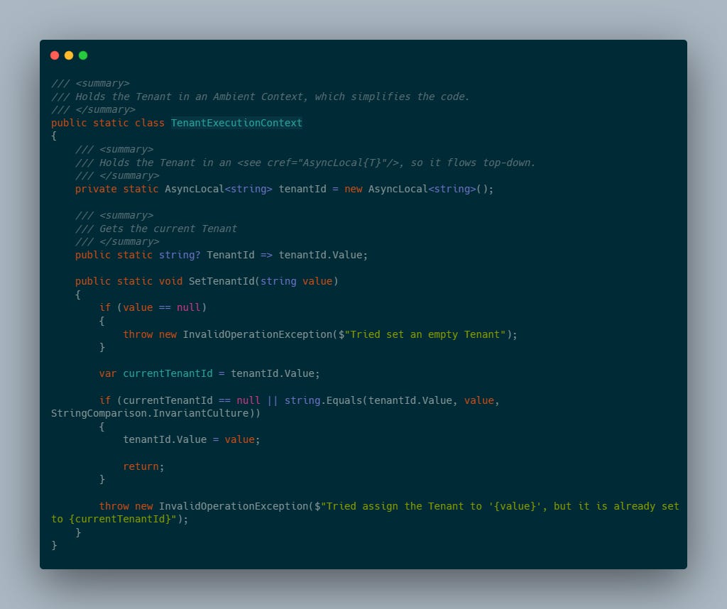 We use the AsyncLocal in order to store that info and we add some simple functions such as SetTenantId which we would then use inside our middleware to set the TenantId and grab it using the public property whenever we need it.